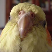And I know dogs and cats speak with their whole bodies, with their posture, when they need to, but a bird emotes with its whole body all the time, not just when it's awake and alert. If a dog is awoken, it'll open an eye and roll it around, and if it's startled maybe it'll jump up (my dog was not among the world's most active, obviously). But a bird--a cockatiel, anyway--will always use its whole body: the puffy, downy chick pose of dozing, with the feathers puffed up, the neck pulled in, the beak almost hidden by feathers; the guard-bird who has just seen a seagull on television and is sleek and slender; the scaredy-bird who has just seen The Exercise Ball or the Falcon at the Meta-Birdfeeder and looks like Alice when she's drunk the potion.